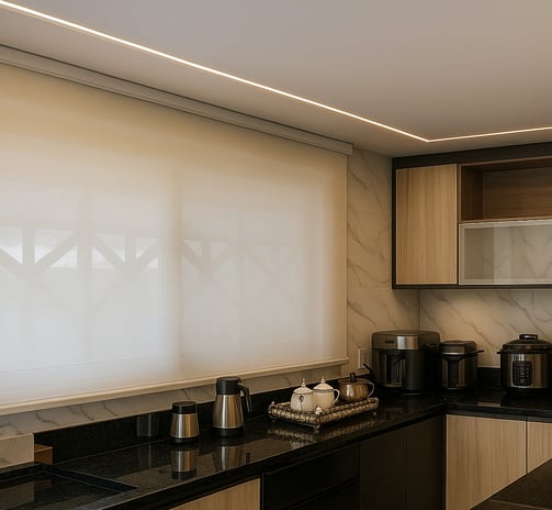 Sistema com acabamento clean e discreto, que esconde o rolo da persiana.